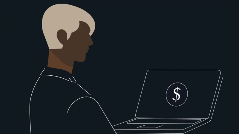 A montage of a busy city street and several workers in offices. Animations of charts and currency exchange.